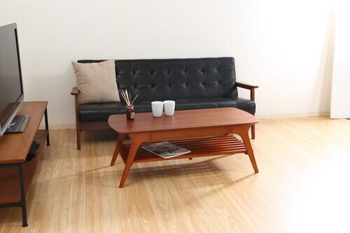 小物類をしまえる引き出し収納と、天板下には雑誌などを置ける棚が付いております。